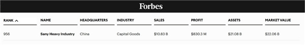 6月12日,福布斯发布2025年“全球企业2000强”排行榜(Forbes The Global 2000)。凭借亮眼的业务表现与发展潜力,三一重工位列全球第956位,荣登中国工程机械企业榜首。