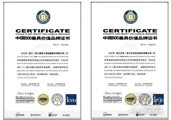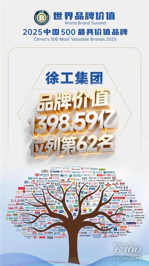 “世界品牌大会”大会上,2025年《中国500最具价值品牌》分析报告正式发布。在这份基于财务数据、品牌强度和消费者行为分析的年度报告中,徐工以1398.59亿元的品牌价值,位列总榜第62位,较2024年再进阶。