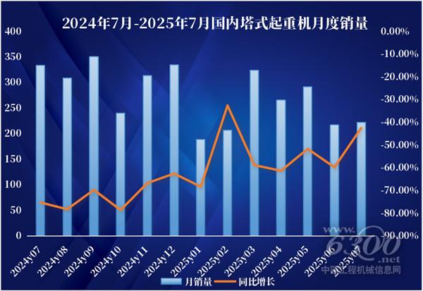 2025年7月,塔式起重机国内销售数据再度令人心惊,当月国内销量仅为222台,同比大幅下降42.5%,环比亦呈下滑趋势。更值得关注的是,1-7月累计国内销量1717台,同比暴跌56%,国内市场需求仍未筑底。