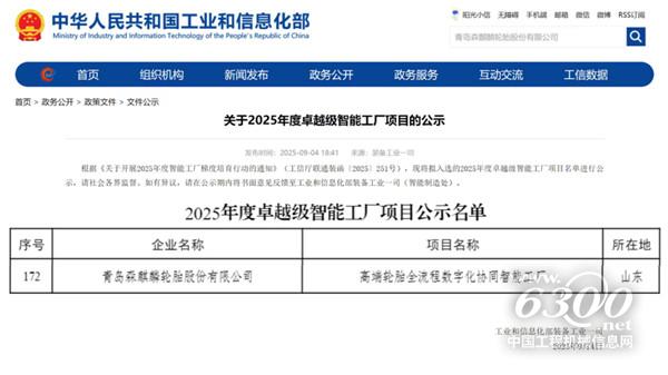 近日,国家工业和信息化部发布《关于 2025 年度卓越级智能工厂项目的公示》。中国轮胎商务网(tirechina.net)获悉,森麒麟凭借 “高端轮胎全流程数字化协同智能工厂”项目成功入选。