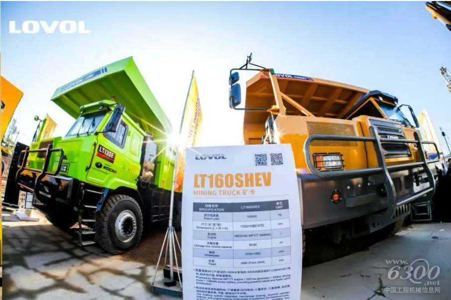 在矿山装备区,4台矿卡同样亮点纷呈。包括 LT105E 和 LT130E 两款电动矿卡,更重磅推出了 LTE120HEV 刚性矿卡和 LT160SHEV 增程矿卡。新能源矿卡的问世,是雷沃响应“双碳”战略,攻克矿山运输能耗与排放的硬核成果。