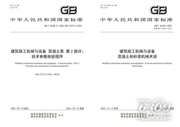 中联重科此次牵头编制的两项国家标准分别是GB/T 25638.2-2025《建筑施工机械与设备 混凝土泵 第2部分:技术参数的检验程序》和GB/T 46760-2025《建筑施工机械与设备 混凝土和砂浆机械术语》。