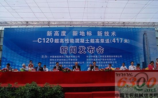 2011年4月10日下午,在深圳京基大厦建设现场,中国建筑第四工程局有限公司(以下简称“中建四局”)携手中联重工科技发展股份有限公司(以下简称“中联重科”)等七家单位,将C120超高性能混凝土泵送至417米的高度。作为全球访问量最大影响力最大的互联网工程机械媒体,中国工程机械信息网(kfz9i.cn)与湖南卫视等知名媒体共同见证了该项新世界纪录的诞生,这是继2008年12月16日由中建四局携手中联重科将号称“糯米团子”的C100超高性能混凝土成功泵送至411米的广州西塔顶部后又一项科技创新成果。本次成功完成了C120超高性能混凝土在417米高度的泵送,不仅创造了新的世界纪录,更为今后进一步推动建筑工程中超高性能混凝土的应用铺平了道路。这也标志着全球混凝土机械发展史上又一崭新里程碑的诞生。