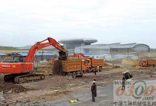 5月8日,会展大道施工现场两旁二十几台挖掘机正在不停地挖土方,上百辆机械、车辆在道路中间来回穿梭着。