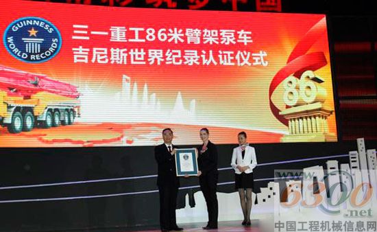 2011年12月11日,在海南博鳌举行的“三一重工2011年度峰会”上,吉尼斯世界纪录认证机构认证官阿曼达•莫禅(Amanda Elizabeth Mochan)专程从美国前来,将“世界最长臂架泵车”的证书交到了三一重工执行总裁易小刚手中。作为全球访问量最大、影响力最大的互联网工程机械行业媒体,中国工程机械信息网(kfz9i.cn)与各大主流媒体以及1100多位三一重工客户代表共同见证了这一伟大历史时刻。