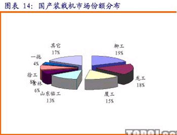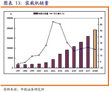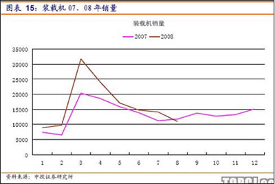装载机在铲土运输机械中销售量最大,应用范围也较广,在基建、矿山建设,煤、铁、铝矿的日常运营中都有运用,但是也因此造成装载机的客户群较为分散,中小用户居多,承包租赁者居多,价格接受能力较弱,在钢价大幅上涨的背景下,装载机提价需多次小幅,较难一步到位。因此我们装载机行业虽然销量继续上升,但销量和效益增幅都要小于低于07年,全年销量可能比07年上升20%左右。