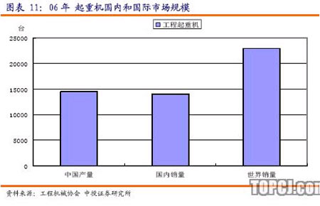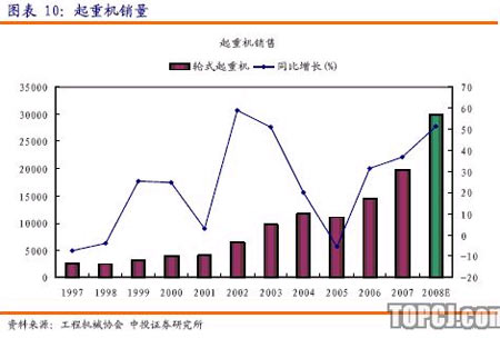 履带起重机的销售形势是所有工程起重机中最好的,由于履带式起重机70%以上应用于大型冶金、石化、电力(火电、核电、水电、风电)工程建设中吊装作业。在我国重型工业发展进程中,得到广泛的应用和超高速的发展,能源的紧缺拉动了电力工业的建设,带动了超重型的履带式起重机的需求,预计08年履带式起重机将达到90%以上的同比增长速度。徐工科技、中联重科和三一重工都将是履带式起重机繁荣的受益者。当然履带式起重机市场容量相对较小,对各公司的整体收益增幅相对较小,但履带起重机能够有效平滑工程机械公司的周期性波动。