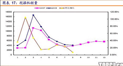 挖掘机08年挖掘机销售继续保持平稳增长,增速前高后低,1季度突显高速增长,2季度增长速度趋缓,1-8月销售挖掘机60337台,比07年同期增长32.3%。