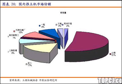 山推股份是国内推土机产品的龙头企业,自1980年成立以来逐渐脱颖而出,成为国内推土机行业龙头,市场占有率达到51%。国内目前推土机的其他主要生产厂家有宣工(18%),上海彭浦,陕西新黄工、洛阳一拖等。