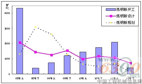 在新增粗钢产能方面,2011年下半年,新开工、新设计、新规划炼钢产能分别为420万吨、736万吨和127万吨,较上半年分别大幅下降80%、32.3%和81.3%,处于近年来最低水平,与此同时,采、选矿投资持续增加。下图为2008年以来各时间段新开工、新设计、新规划炼钢产能情况。企业已从单纯追求扩大产能向技术改造、资源开发、循环经济方向发展,抑制产能过剩、加快产业结构调整已经成为共识。