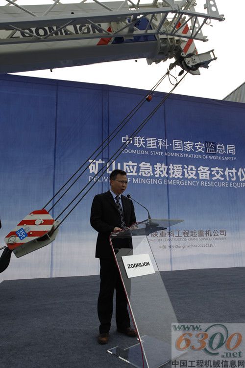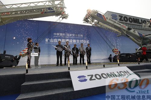 此次中联重科•国家安监总局——矿山应急救援设备交付仪式暨技术交流会在湖南长沙中联重科泉塘工业园隆重举行。国家矿山应急救援项目专家组组长朱正平、中国煤炭研究院重庆分院主任张广勋和中联重科副总裁李江涛先生、中联重科工程起重机公司副总经理苏敏先生、中联重科工程起重机公司轮胎起重机制造分公司总经理段巨臣先生以及来自湘煤集团,沈阳、陕西、江西救援大队的众多嘉宾共同出席了本次交付仪式。