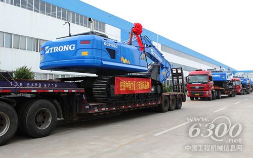 在王跃钦副总经理的号令下,伴随着现场人员的掌声和欢呼声,满载着20台挖掘机的车队身披大红花,浩浩荡荡驶出公司。