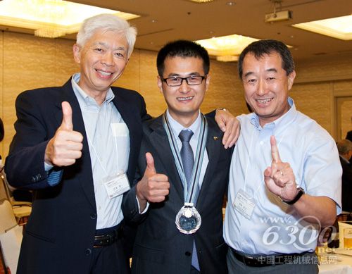 日立建机株式会社辻本雄一社长(左)与日立建机(上海)有限公司河本忠之副总经理(右)向陈磊选手获得优胜表示祝贺