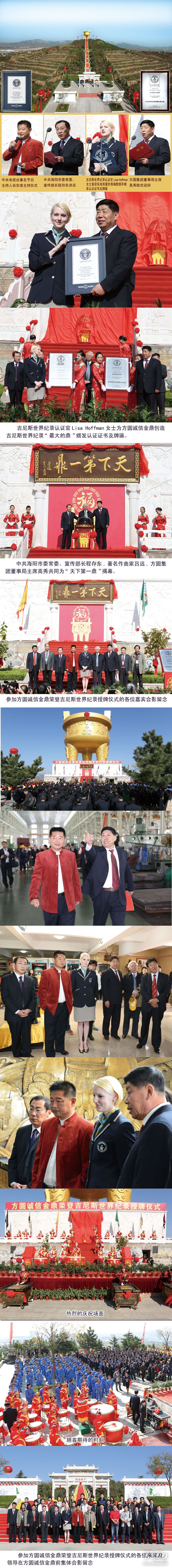 金秋十月,秋高气爽,金菊绽放,丹桂飘香,硕果盈人,10月26日上午,方圆诚信金鼎荣登吉尼斯世界纪录授牌仪式在方圆集团总部东隅拖山山顶隆重举行,吉尼斯世界纪录认证官Lisa Hoffman女士,我国著名作曲家吕远,海阳市有关领导,中央电视台、央视网、新华社、新华网等50余家新闻媒体记者及方圆集团中层以上领导干部、管理人员、职工代表800余人参加仪式。仪式由中央电视台著名节目主持人肖东坡主持。