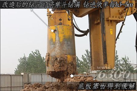 原因找到了,马上进行整改。工法师顶着烈日,寻找加工厂加工齿座板,购买钻齿,并现场进行整改。拆除原钻斗上不合适的导向齿及齿座,将加工完成的齿座板重新加装到钻斗底板上,使导向齿与排齿形成连续性,消除糊齿区,彻底解决打滑问题。