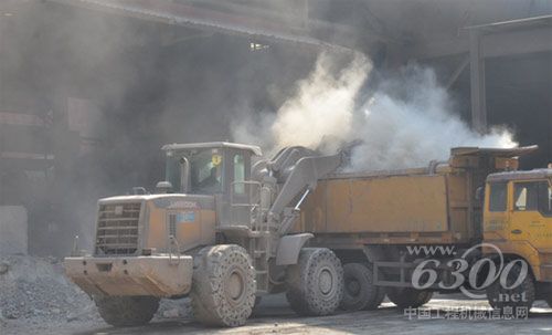 漫天粉尘飘荡,滚烫近1000度的钢渣从生产线上翻涌而下,严阵以待的1台6吨装载机轰鸣前往,铲斗插入热气腾腾的钢渣中,高高举起,瞬间滚滚浓烟将他包围淹没,3秒种后,装载机冲出浓烟转身将钢渣倒入等候一旁的卡车里,70秒后卡车满载而走。这台“神勇战机”就是徐工LW600K大吨位装载机。