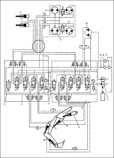 1—油泵;2、4—分配阀组;3—单向阀;5—速度限制阀;6—推土板油缸;7、8—行走马达;9—双速阀;10—回转马达;11—动臂油缸;12—辅助油缸;13—斗杆油缸;14—铲斗油缸;15—背压阀;16—冷却器;17—滤油器