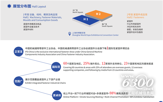 2020中国·上海国际紧固件工业博览会(International Fastener Show China)由中国机械通用零部件工业协会、中国机械通用零部件工业协会紧固件分会、上海爱螺展览有限公司、汉诺威米兰展览(上海)有限公司共同主办,中国20多个省、市、区紧固件行业协会协办。IFS China是搭建中国紧固件行业与全球螺丝人的沟通合作桥梁,是紧固件行业风向标、极具规模和创新的紧固件工业博览会;吸引海内外紧固件成品、设备、模具及耗品生产商,紧固件产品采购商、分销商、批发商共赴盛宴。