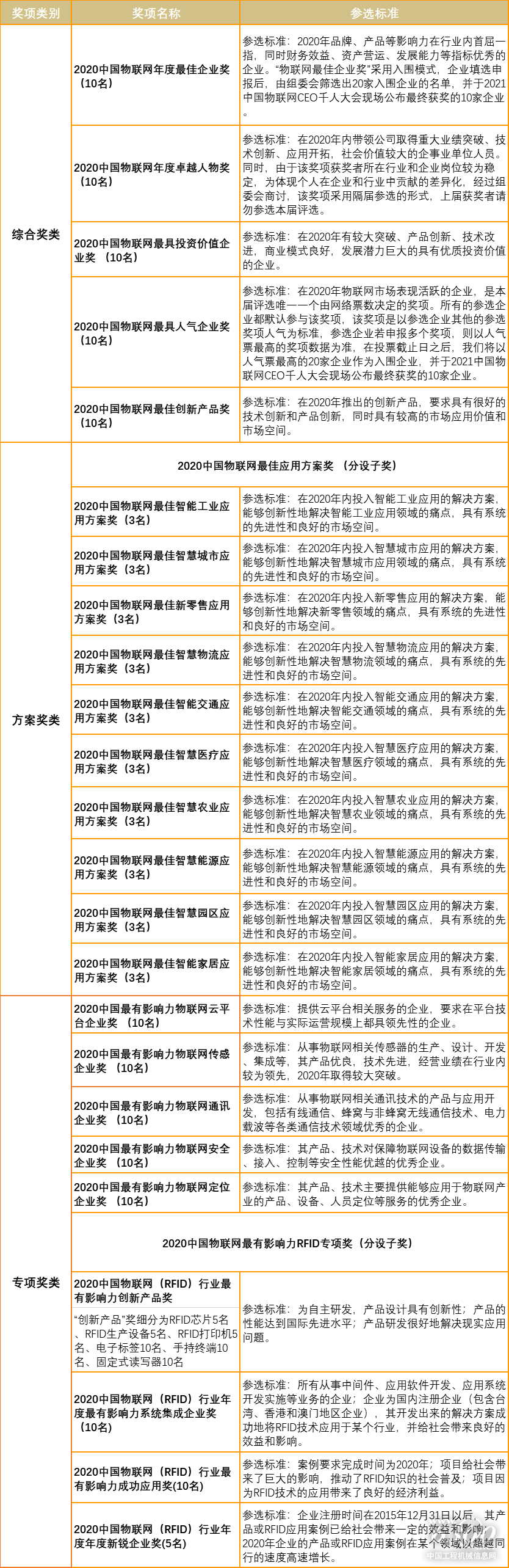 "年度物联网最佳企业奖"旨在表彰在过去一年里,品牌、产品等影响力在行业内首屈一指,同时财务效益、资产营运、发展能力等指标优秀的企业,企业可结合自身实际发展状况进行自由申报。