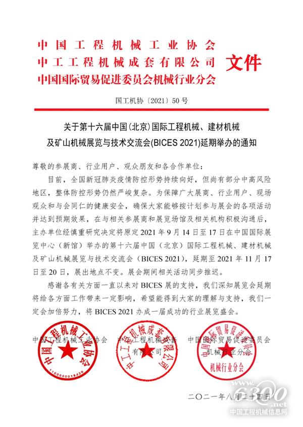关于第十六届北京工程机械展BICES 2021延期举办的通知