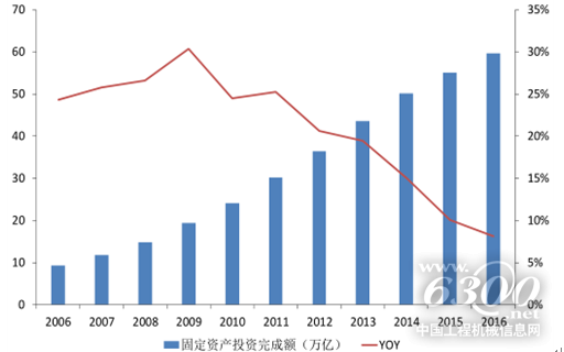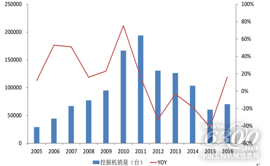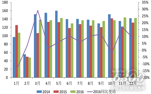 基建投资增长拉动需求 。工程机械主要下游包括基础设施建设和房地产等固定资产投资领域。从统计局获悉,2016 年全国固定资产投资(不含农户)59.7 万亿元,同比增长 8.14%。其中,制造业投资、房地产投资、基建投资在固定资产投资中占比分别为 31.48%、17.2%、19.93%。2016 年制造业投资增速仅为 4.2%,2016 年房地产开发投资累计增速为 6.9%,2016 年基础设施投资同比增速为 17.4%。可以看出,2016 年工程机械回暖的主要原因是由于基建投资大幅增长拉动固定资产投资增长。2017 年我国固定资产投资增速预计保持在 8%左右,随着房地产增速大概率持续放缓,基建将继续成为稳定投资及稳增长的主要力量,整体规模预计在 16 万亿元。