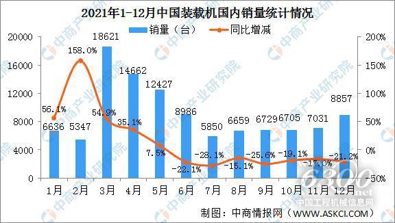 据中国工程机械工业协会对22家装载机制造企业统计,2021年12月销售各类装载机8857台,同比下降21.2%。其中:3吨及以上装载机销售7729台,同比下降26.1%。总销售量中国内市场销量6316台,同比下降26%;出口销量2541台,同比下降6.17%。