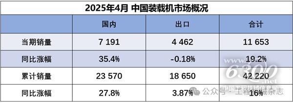 2025年1—4月,共销售各类装载机42220台,同比增长16%。其中国内销量23570台,同比增长27.8%;出口量18650台,同比增长3.87%。